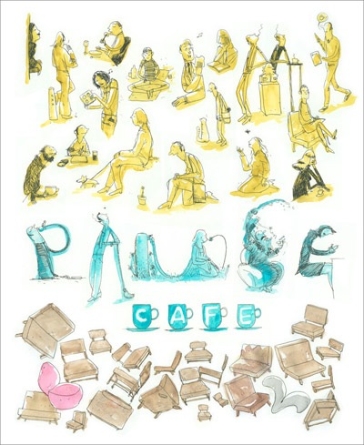 I’m very happy to be able to share the latest entry in my “Cafe Pause Poster Series” (#5), a contribution by Amsterdam-based art director Luis Mendo. You know about the Tokyo map he just produced for the next issue of Journal de Nîmes, and now here’s also his homage to the cafe. The concept revolves around the seats found in the cafe — there are 24 (all pictured), with 23 people shown, the idea being that the 24th customer is you!
