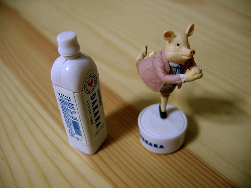 If you buy a bottle of Dakara these days, you get this tiny little figure with it. The pig is seen in recent TV commercials. There are magnets at the base of the pig and the bottle, so when you approach the bottle to the pig you can make it spin (as it does, prancing around, in the TV commercials).