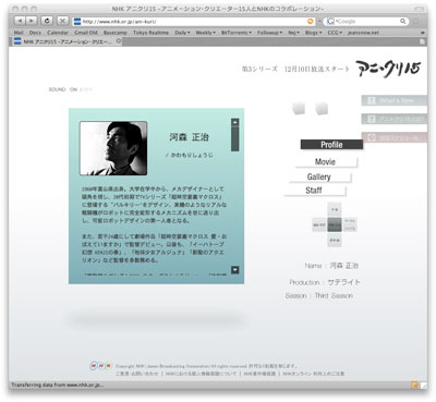 NHK have posted all five shorts for the third season of their ANI-KURI series online (the first two seasons are available as well). The third season has quite the line-up of directors: Shoji Kawamori (MACROSS), Satoshi Kon (PAPRIKA), Mahiro Maeda (BLUE SUBMARINE NO. 6), Michael Arias (TEKKONKINKREET) and Makoto Shikai (VOICES OF A DISTANT STAR). Via Anime News Network.