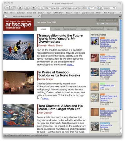 Artscape International is a monthly version in English of Japanese art website Artscape, edited by Alan Gleason. You’ll find reviews and commentary, as well as an exhaustive database of museums and galleries.